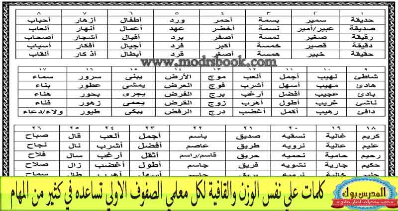 كلمات علي نفس الوزن والقافيه هامه لكل معلمي الصفوف الاولي